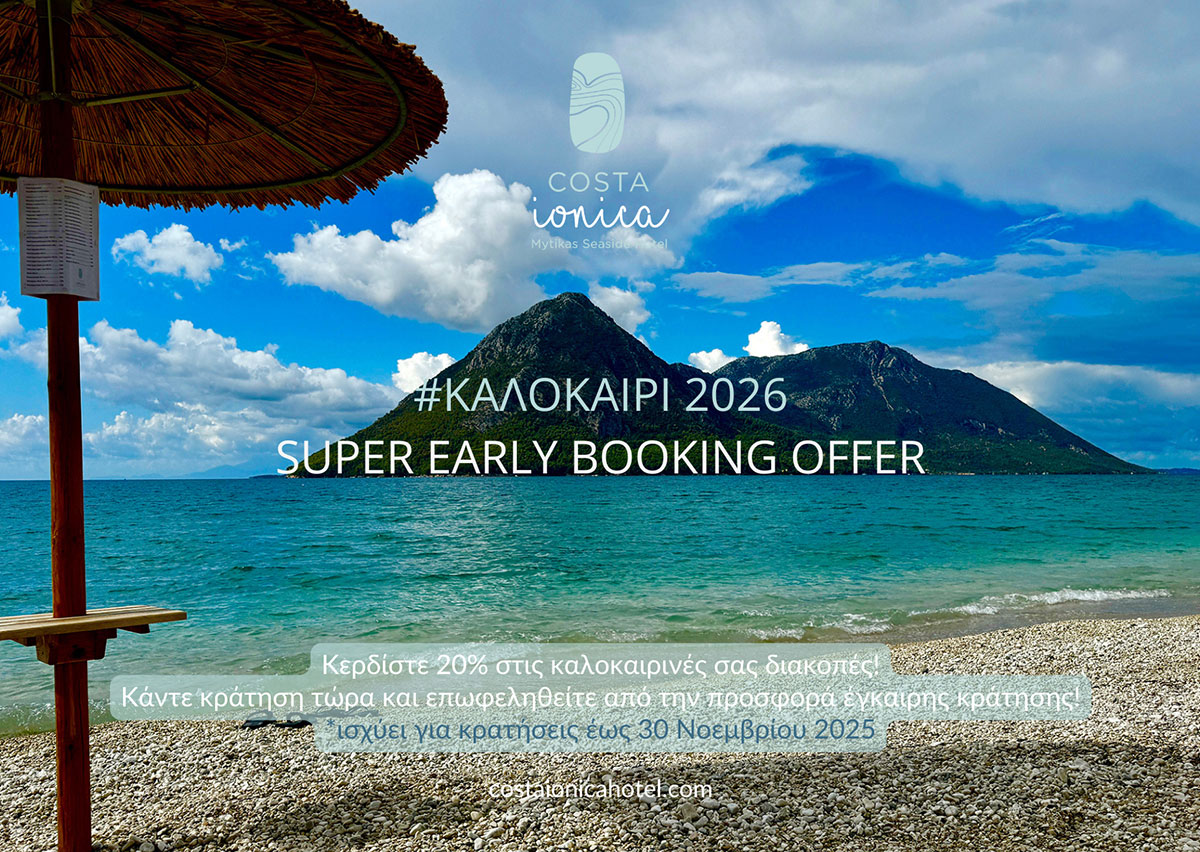 Επωφεληθείτε από την αποκλειστική προσφορά έγκαιρης κράτησης Super Early Booking Offer για το καλοκαίρι 2026 και εξοικονομήστε 20% επιπλέον των τωρινών rates, για τις διακοπές σας στο Costa Ionica Mytikas Seaside Hotel.