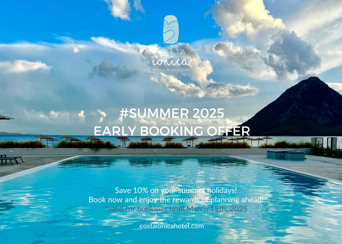 Take advantage of our exclusive Early booking offer for Summer 2025 and save 10% on top of our rates for your holiday to Costa Ionica Mytikas Seaside Hotel.