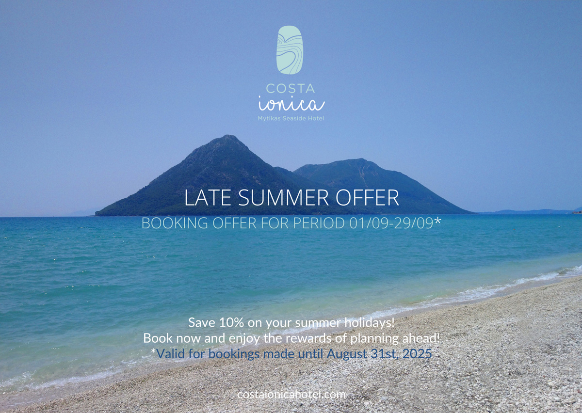 Take advantage of our exclusive Late Summer booking offer and save 10% on top of our rates for your holiday to Costa Ionica Mytikas Seaside Hotel.