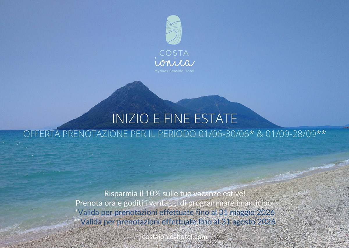 Prenota ora e goditi i vantaggi di programmare in anticipo! Approfitta della nostra esclusiva offerta Early Booking (Prenota Prima) per l’estate 2026 e risparmia il 10% sulle nostre tariffe per la tua vacanza al Costa Ionica Mytikas Seaside Hotel.